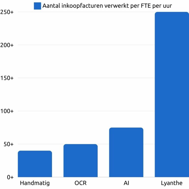 Lyanthe levert met haar documentspecialisten 100% herkenning van facturen en dit is dé basis voor de verdere automatisering. Zo stelt Lyanthe een gemiddeld accountantskantoor in staat, om na 3-6 maanden werken met Lyanthe, meer dan 250 facturen per uur te boeken (zie tabel). In praktijk is reeds bewezen dat > 1.000 facturen p/u ook behaald kan worden!